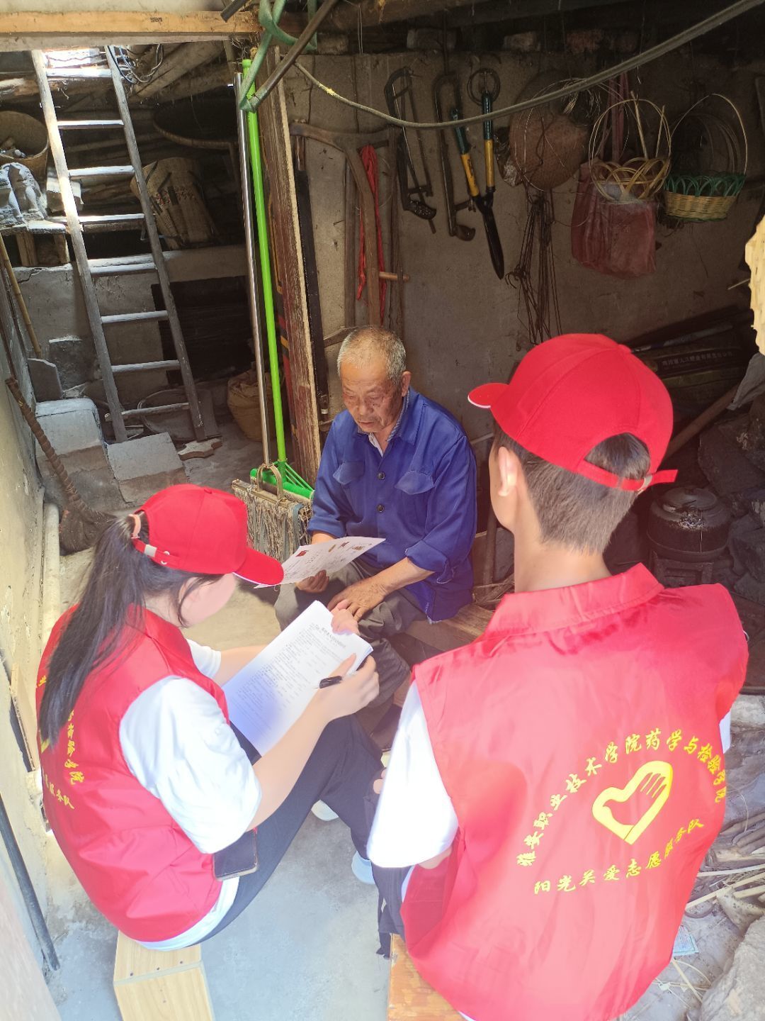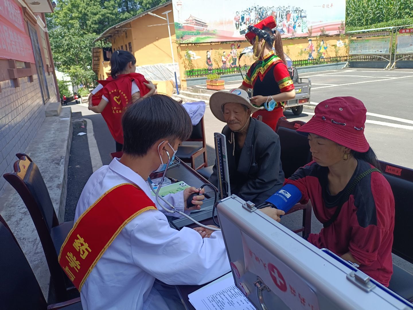 7月9日,上午9点到达荥经县宝峰彝族乡,顶着烈日,志愿服务队迅速开始了义诊活动,血压组的同学们为村民进行血压测量,宣传组的同学们为村民们宣传预防高血压的方法;下午,问卷调查小组的同学们进行入户调查,并为村民们讲解高血压及用药健康情况的知识、基本医学常识以及当下流行疾病的防治方法。