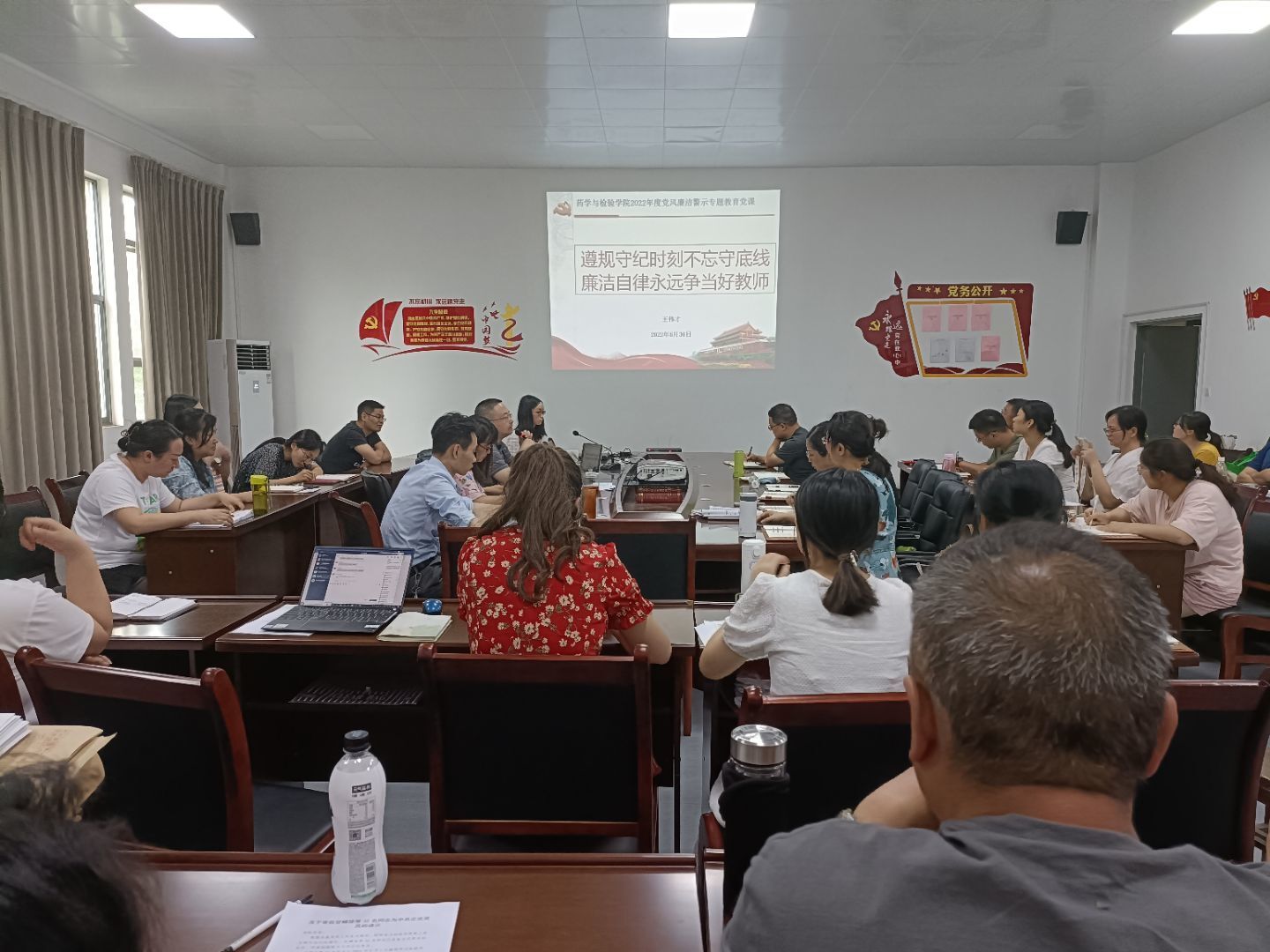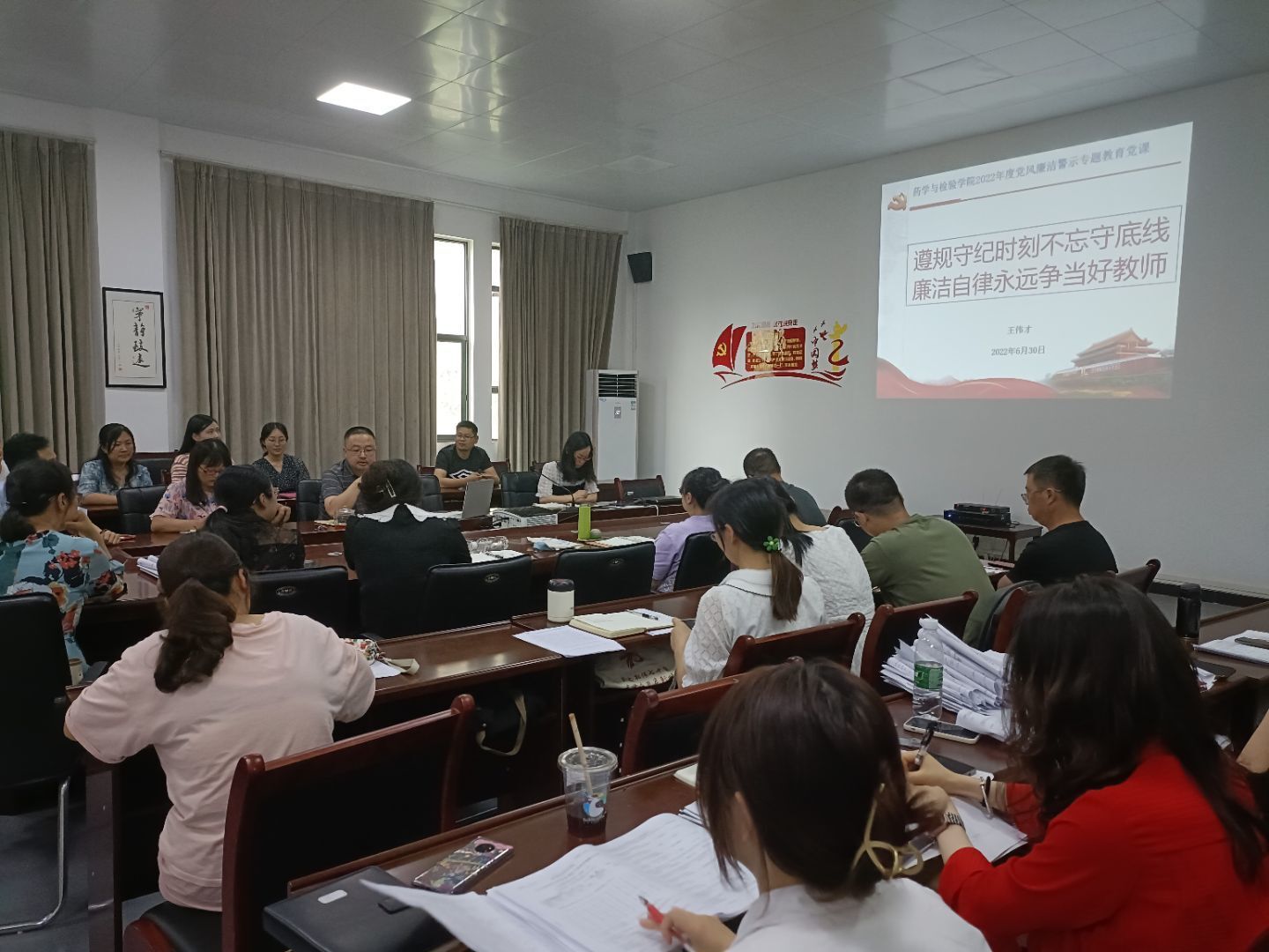 6月30日,药学与检验公司党总支在食品药品生产性实训基地二楼205大会议室开展党风廉洁警示教育,由党总支书记王伟才同志作题为《遵规守纪时刻不忘守底线、廉洁自律永远争当好教师》的专题党课,近50名党员教师和非党员教职工参加了讲座。
