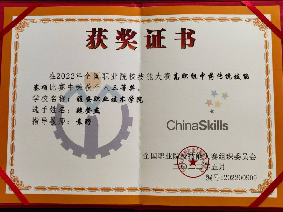 7月28日至30日,2022年全国职业院校技能大赛中药传统技能赛项在重庆三峡医药高等专科公司举行,来自全国29个省(市、自治区)的51支参赛队伍参加。经过三天六个子赛项的激烈角逐,beat365员工魏登燕斩获三等奖一项。