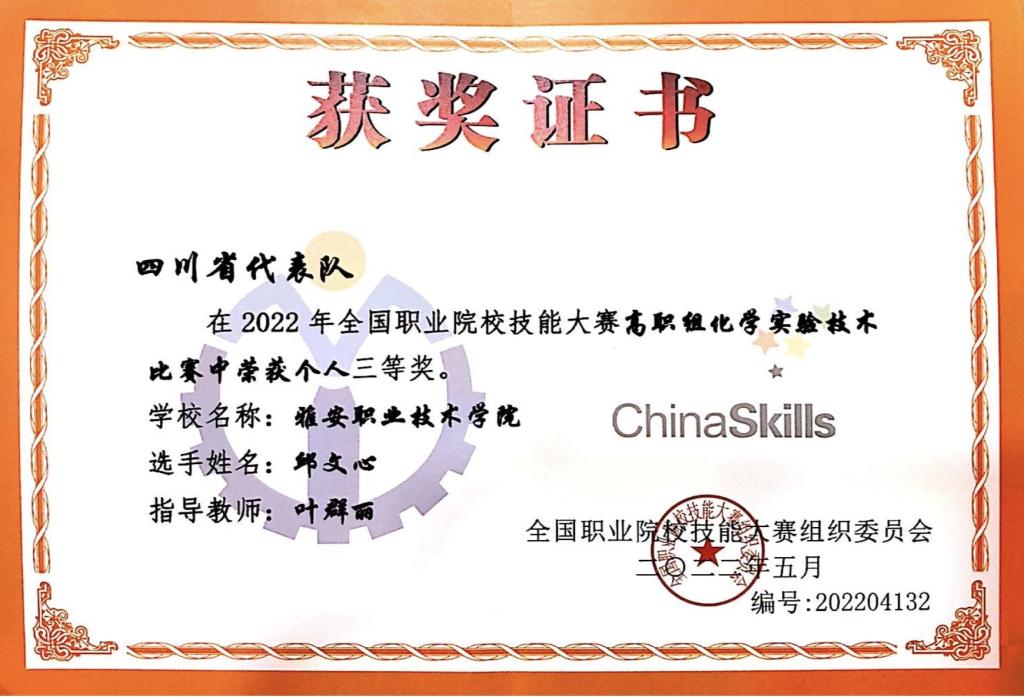 8月15日至16日,教育部主办的2022年全国职业院校技能大赛(高职组)化学实验技术赛项在潍坊职业公司举行,来自全国56所院校的56名选手参赛。公司beat3652020级药学专业员工邱文心作为四川省代表队选手之一参加比赛,经过两天三个子赛项的激烈角逐,最终斩获三等奖,为四川省在2022年国赛上再添一奖!