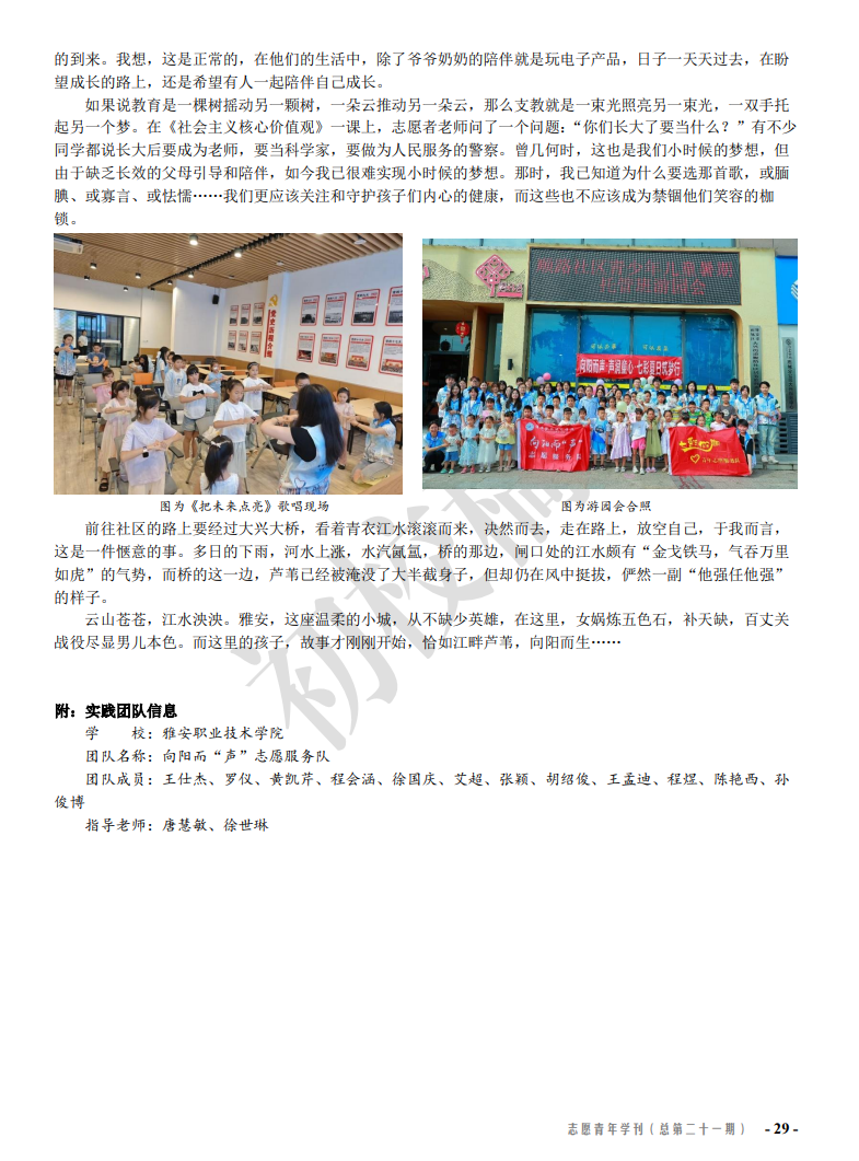 在此次活动中,团队成员积极响应国家号召,躬耕实践,以实干的精神、务实的作风、关心关爱少年儿童,助力儿童健康成长,生动展现了雅职青年的精神面貌。