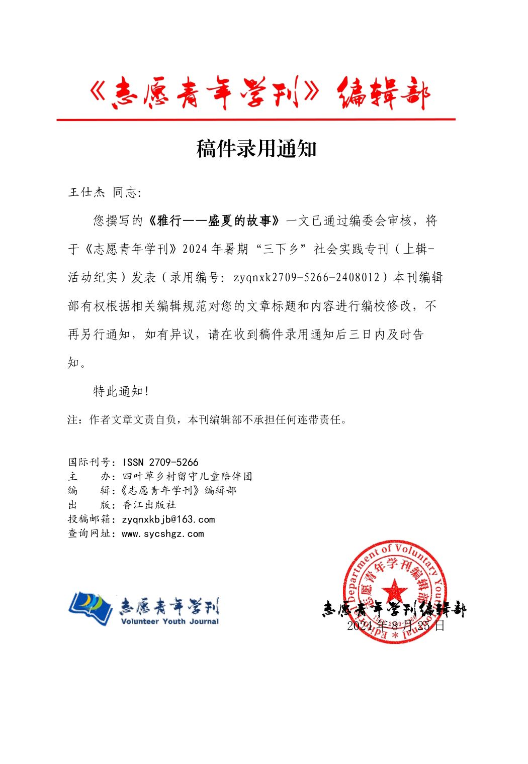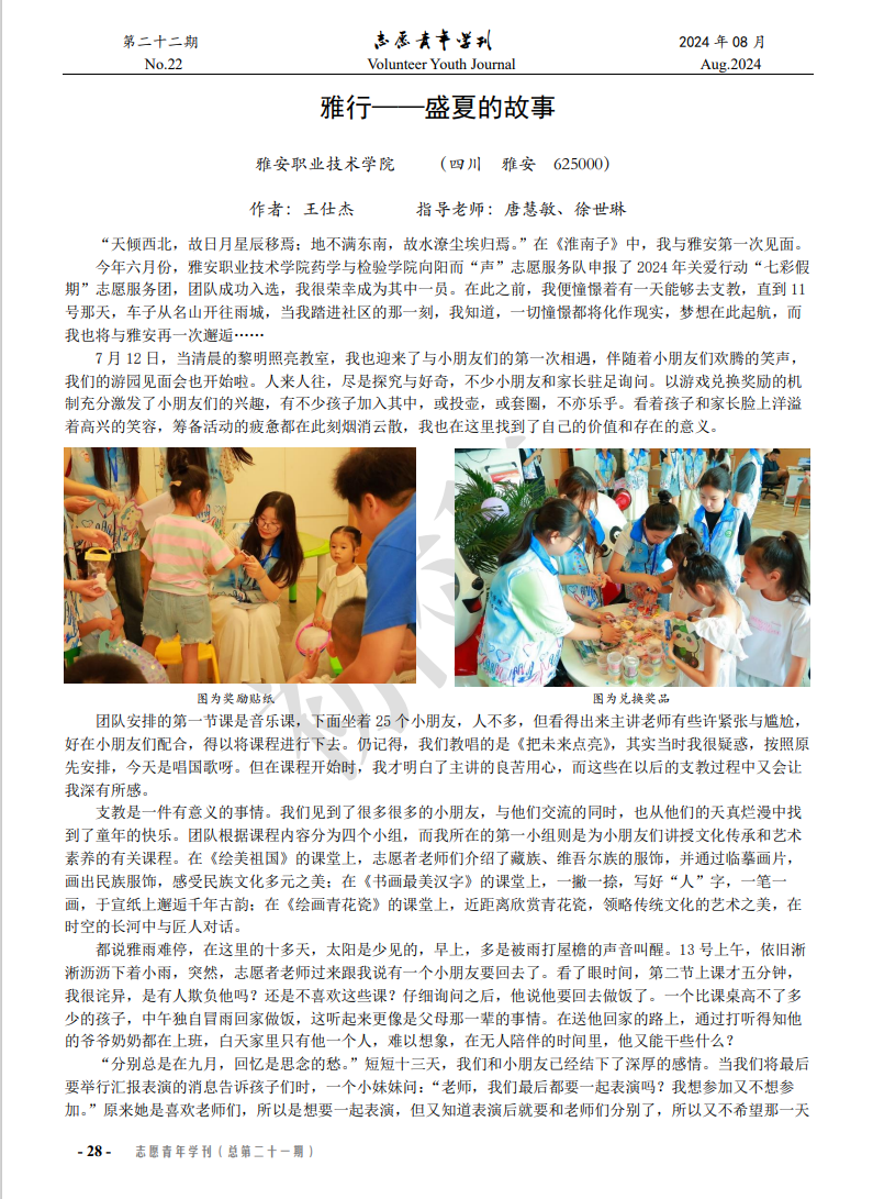由普专现代农业技术23-1班王仕杰同学撰写,唐慧敏、徐世琳老师指导的《雅行——盛夏的故事》一文已通过编委会审核,在《志愿青年学刊》2024年暑期“三下乡”社会实践专刊(上辑-活动纪实)发表(录用编号:zyqnxk2709-5266-2408012)。