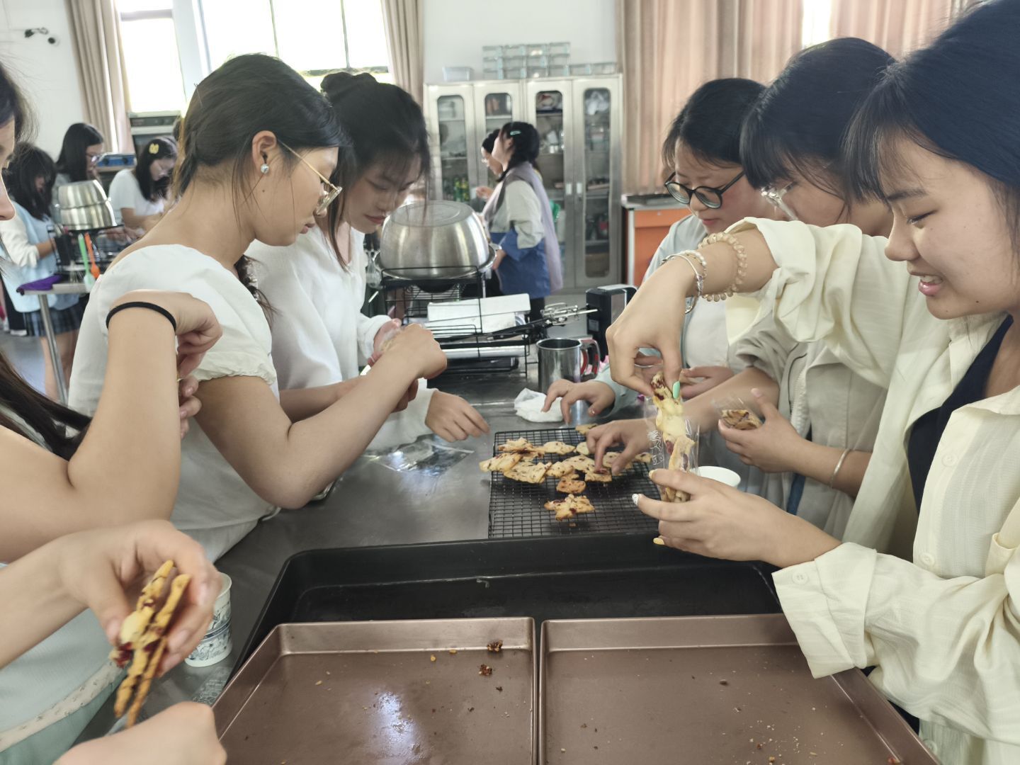 活动前期同学们自由组队,分为了8组,在活动过程中,同学们在工作人员的指导下,利用现场准备好的加工器具在三个小时的时间里一步步地将分散的食材“变”成了美味的蔓越莓饼干。同时,在制作的过程当中每个组员工协作,各司其职,在收获劳动果实的同时也收获了合作的快乐。当饼干的香味溢出烤炉飘散在教室中,金灿灿的饼干顺势出炉时,一切的努力化为甘甜浸入人心,标志着本次活动的圆满成功。