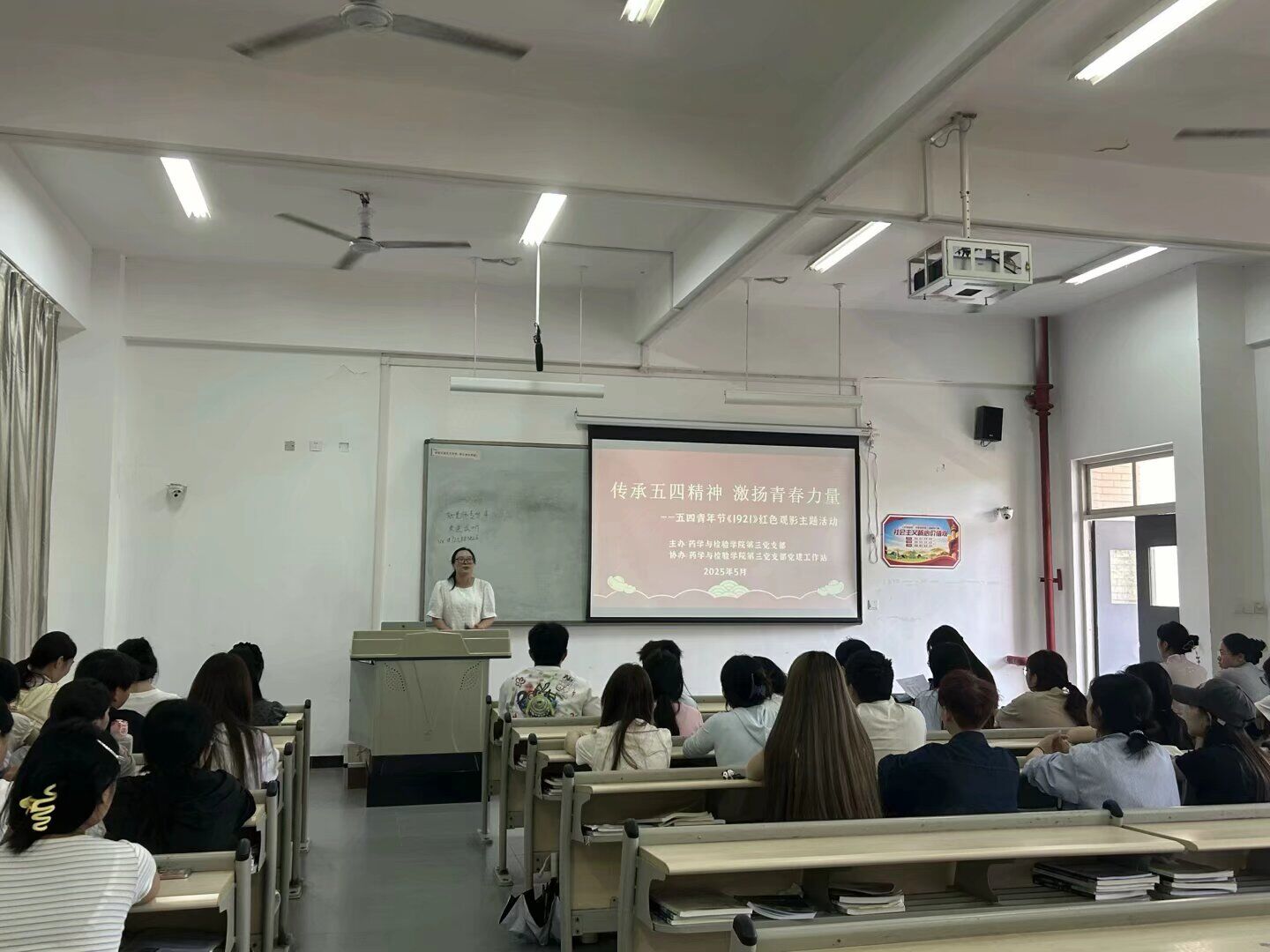 2025年5月20日中午12:40,beat365第三党支部组织了49名入党积极分子,在1103开展以“传承五四精神,激扬青春力量”为主题的观影活动。此次活动旨在通过观看历史题材电影《1921》,引导同学们更深刻地理解五四精神,激发他们的爱国热情和奋斗精神,厚植家国情怀,强化责任担当,坚定理想信念。