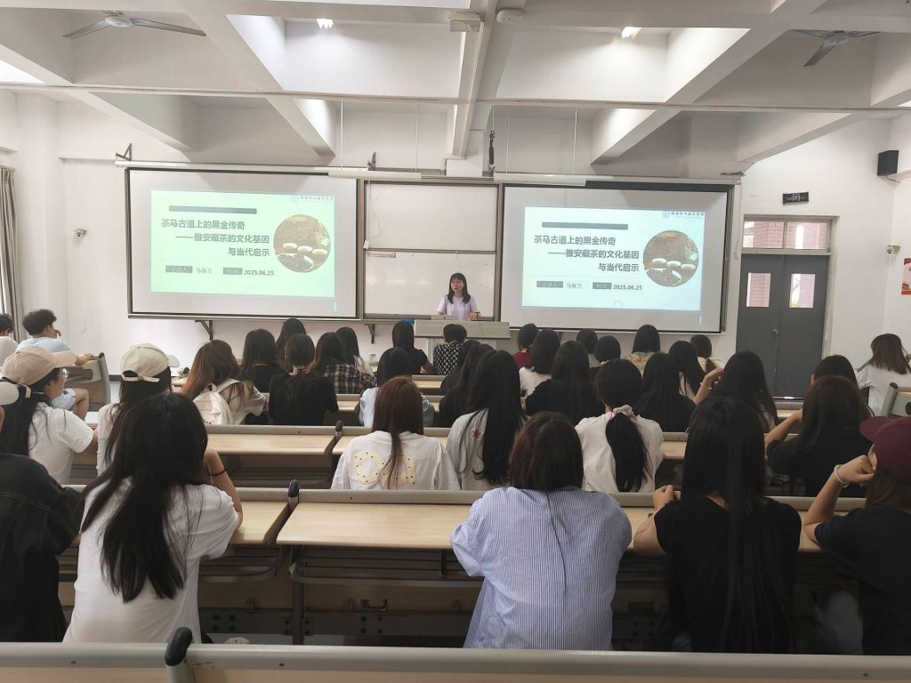讲座上,马春兰老师以雅安藏茶为核心展开系统讲解。首先回溯雅安藏茶的历史渊源,串联起茶马古道记忆,生动展现藏茶在岁月长河中,作为地域文化传承关键载体,如何深深扎根、延续根脉;接着深入剖析藏茶的功能,从传统饮用价值到现代健康意义,结合品茗技巧,带同学们全方位认识藏茶实用价值,解锁品茗门道;最后从历史、民俗、精神等多维视角,解读藏茶文化基因,挖掘藏茶承载的文化内涵,以及对当代文化传承、产业发展的启示。现场同学们全程专注,被藏茶文化独特魅力吸引,互动环节纷纷踊跃发言,或分享感悟、或请教疑问,交流氛围热烈,在思想碰撞中深化对雅安藏茶的认知 。