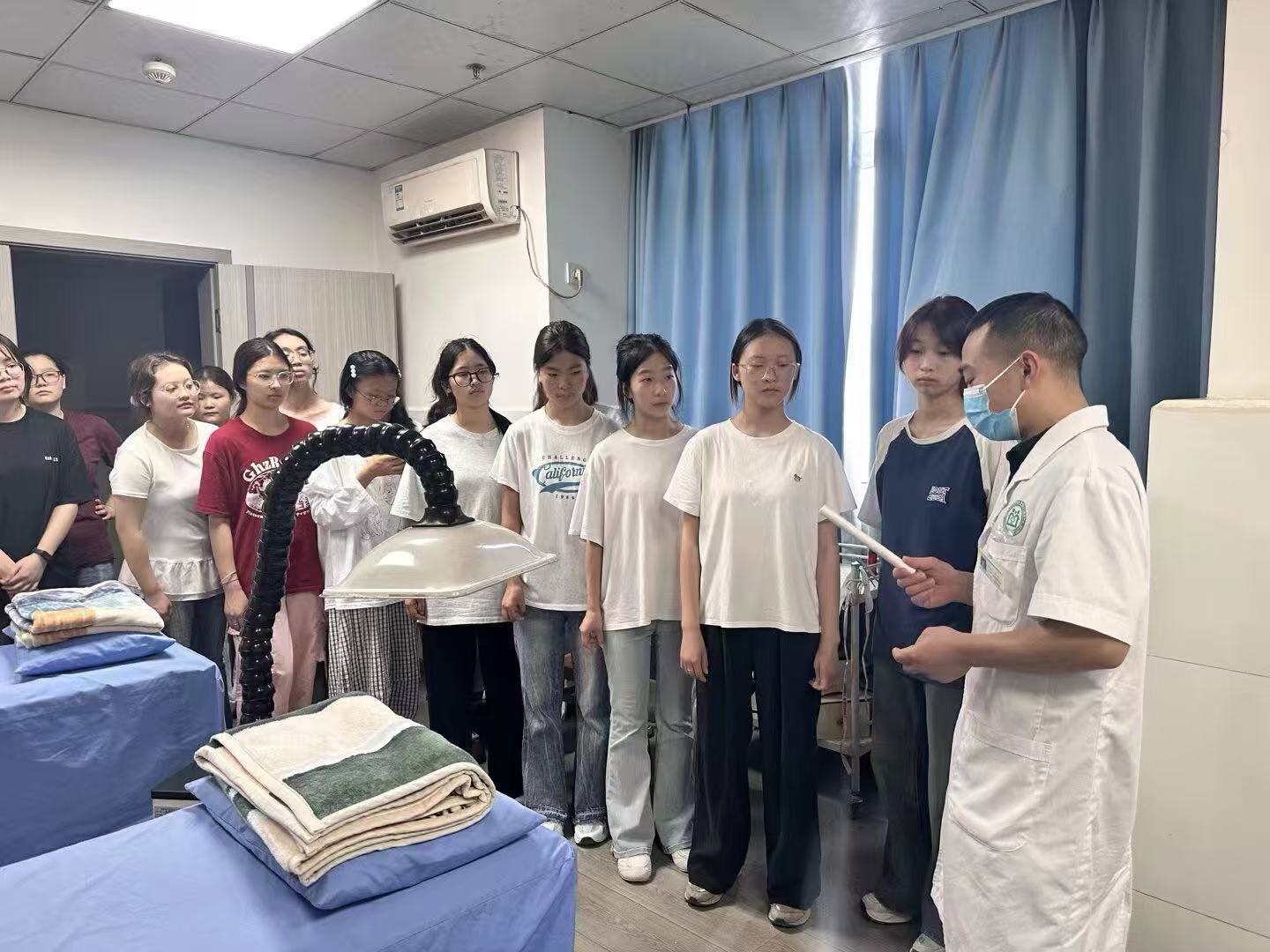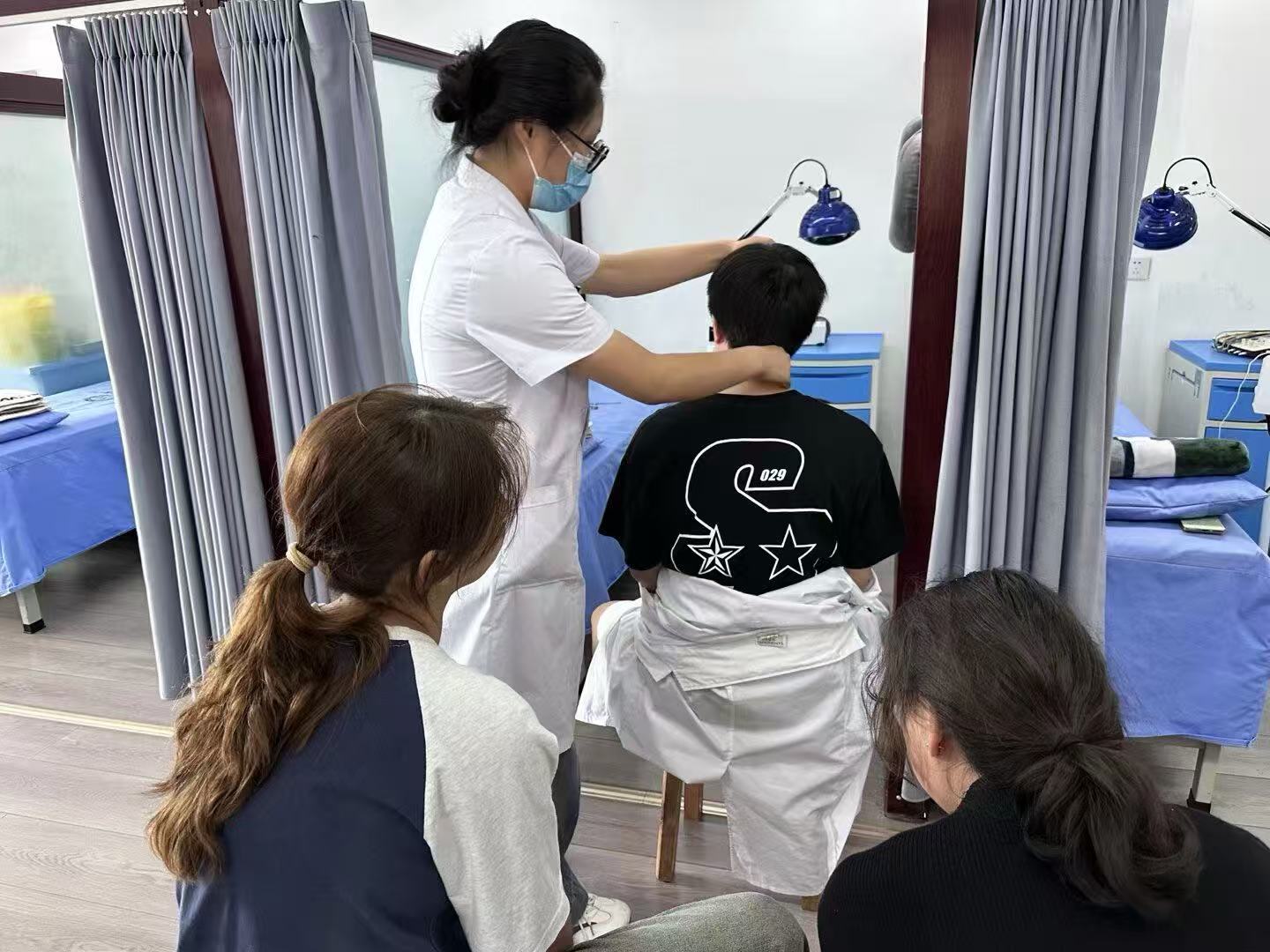 活动现场,范医生等资深中医师化身“杏林引路人”,通过“理论讲解+临床示教+实践体验”三位一体的教学模式,带领同学们探寻中医奥秘。在理论环节,医师们以“经络为纲、病症为引”的讲解方式,深入浅出地剖析了推拿、拔罐等中医特色疗法的精髓。特别是针对现代人常见的颈肩问题,现场演示了“风池穴解头痛、肩井穴缓酸痛"的精准推拿手法;在拔罐教学时,通过“辨罐印识体质”的互动环节,让同学们直观理解“紫黯为寒、鲜红为热”的中医诊断智慧。实践环节更是精彩纷呈:同学们或屏息凝神练习“轻重有度、刚柔相济”的推拿手法,或惊叹连连体验“罐到病所”的拔罐疗法,在"望闻问切”的沉浸式体验中,切身感受着“一根银针治百病,一把草药解千愁”的中医神奇魅力。