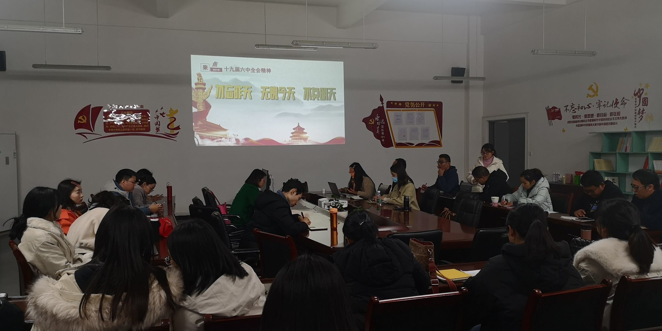 罗书记最后强调,我们全体老师要充分认识党的十九届六中全会的重大现实意义和深远历史意义,坚决把思想和行动统一到党的十九届六中全会精神上。作为新时代的高校教师,我们要从党百年奋斗的光辉历程中汲取营养,认真学习、领会、贯彻全会精神,把思想和行动统一到以习近平同志为核心的党中央决策部署上来,不忘教育报国初心、牢记立德树人使命,进一步传承红色基因;以铸牢中华民族共同体意识为主线,加强师德师风建设,践行为党育人、为国育才使命;教育引导员工勿忘昨天的苦难辉煌,无愧今天的使命担当,不负明天的伟大梦想!