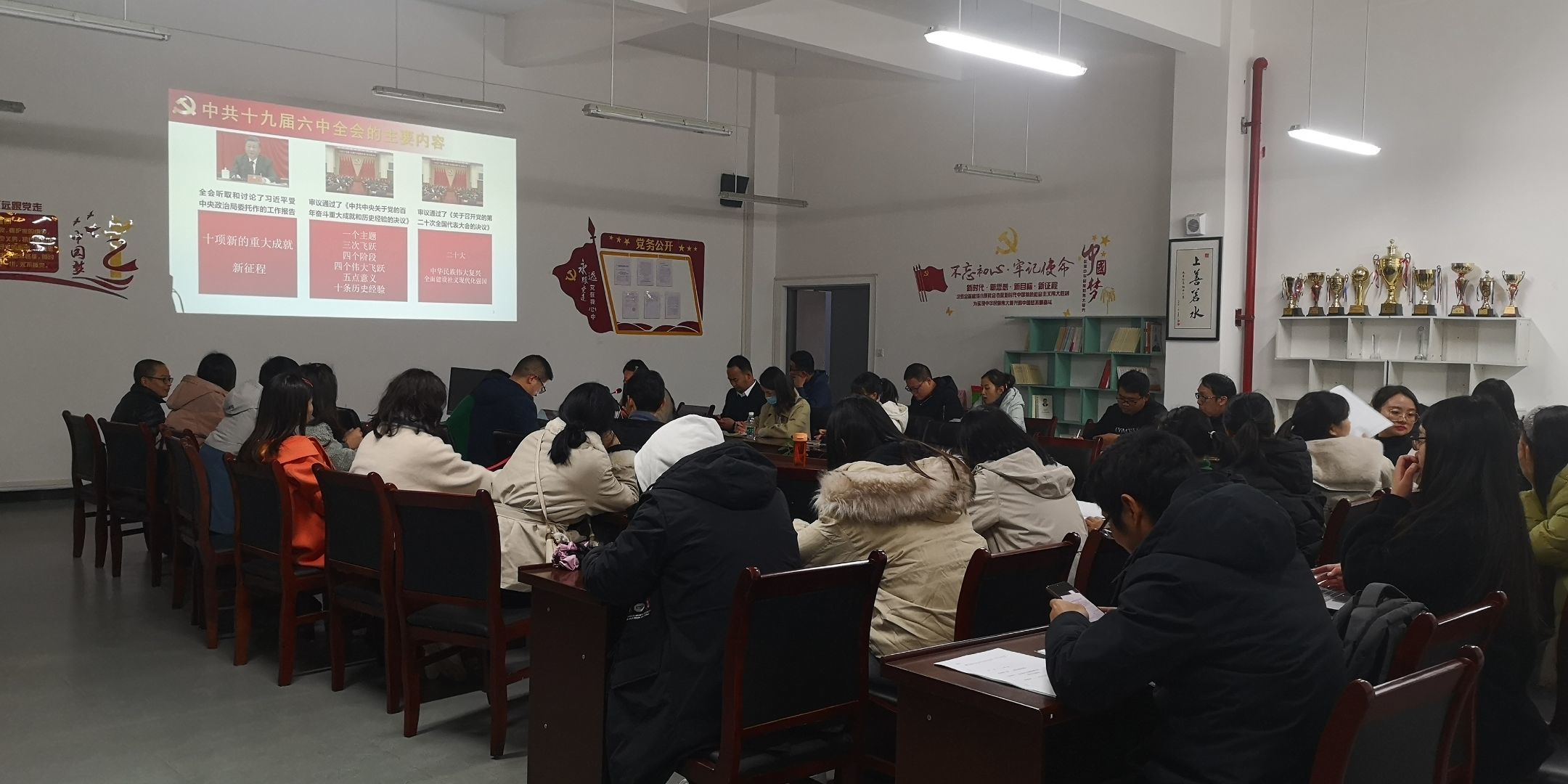 中国共产党第十九届中央委员会第六次全体会议,于11月8日至11日在北京举行。学习贯彻全会精神是当前和今后一段时期的重要政治任务,beat365在前期组织全体师生利用政治理论学习、团总支会等开展学习研讨的基础上,11月24日,在经开区beat365会议室再次聚焦党的十九届六中全会精神。会议由党总支副书记罗小莉主持,全体教职工参加。