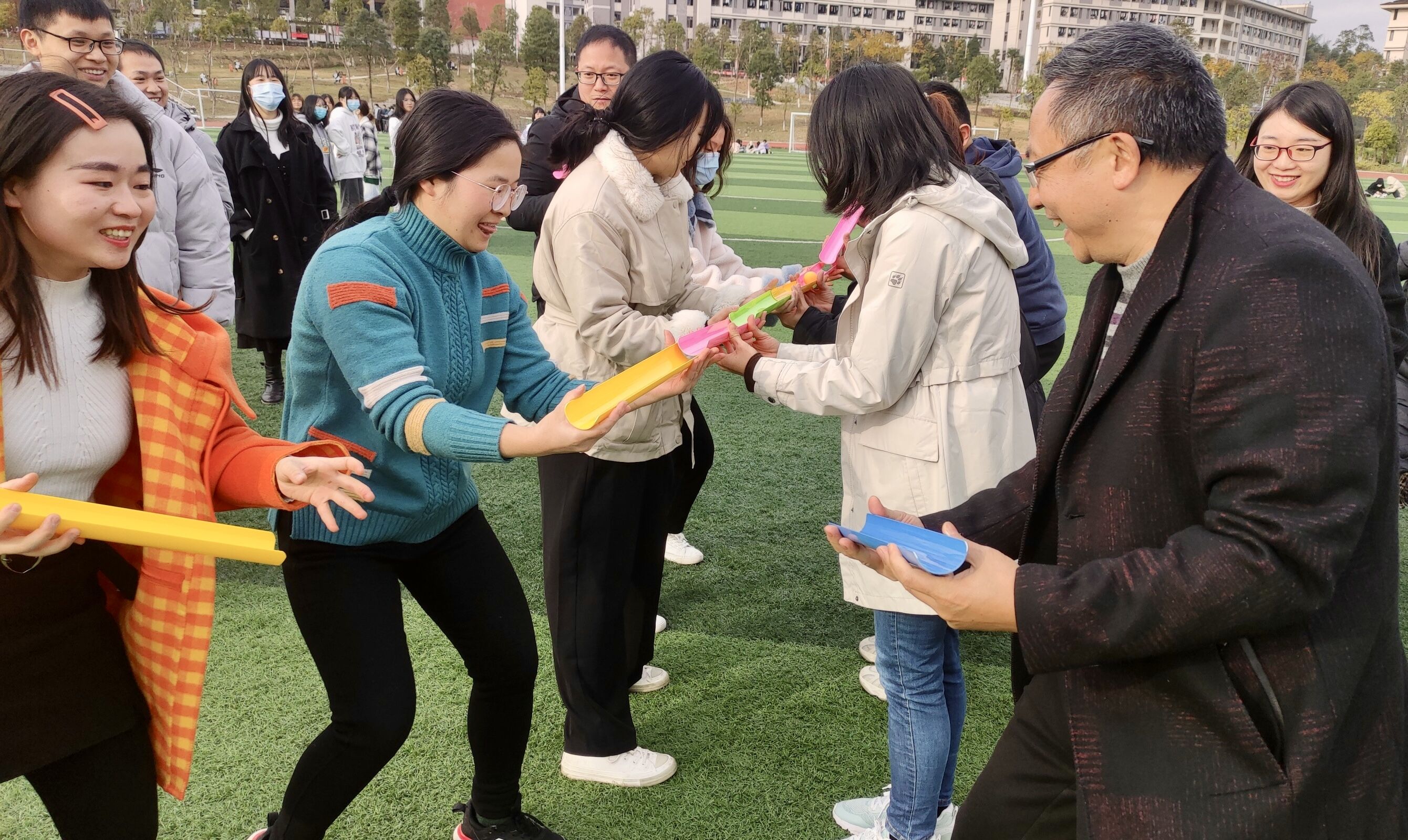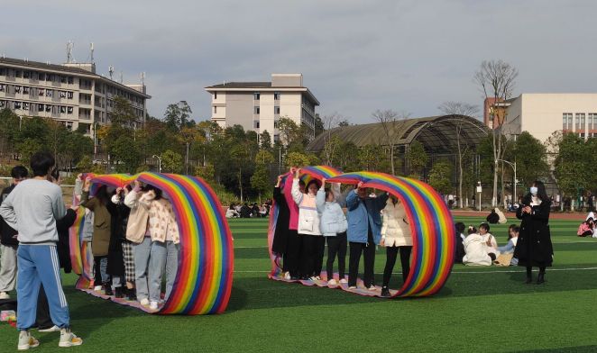 本次运动会将党史知识竞赛环节穿插于疯狂毛毛虫、四人五足、乒乓球接力、同心鼓颠球等五个团体比赛项目中,听到开始口令后员工志愿者提出关于党史知识问题,参赛老师们开始答题,答对五题的队伍率先出发,向前绕过标杆回到起点计时结束。在党史知识竞赛环节中,参赛队员铆足干劲,充满自信,上演了一幕扣人心弦抢答争夺战,比赛“火药味”渐渐弥漫,现场氛围紧张激烈,精彩纷呈,全体参赛师生齐心协力、配合默契、奋勇拼搏,充分发挥了不服输的竞技精神。经过两个多小时的激烈角逐,三支参赛队伍都取得了可喜的成绩,在合影留念后,此次“党史忆峥嵘,团建展风采”趣味运动会便正式落下帷幕。