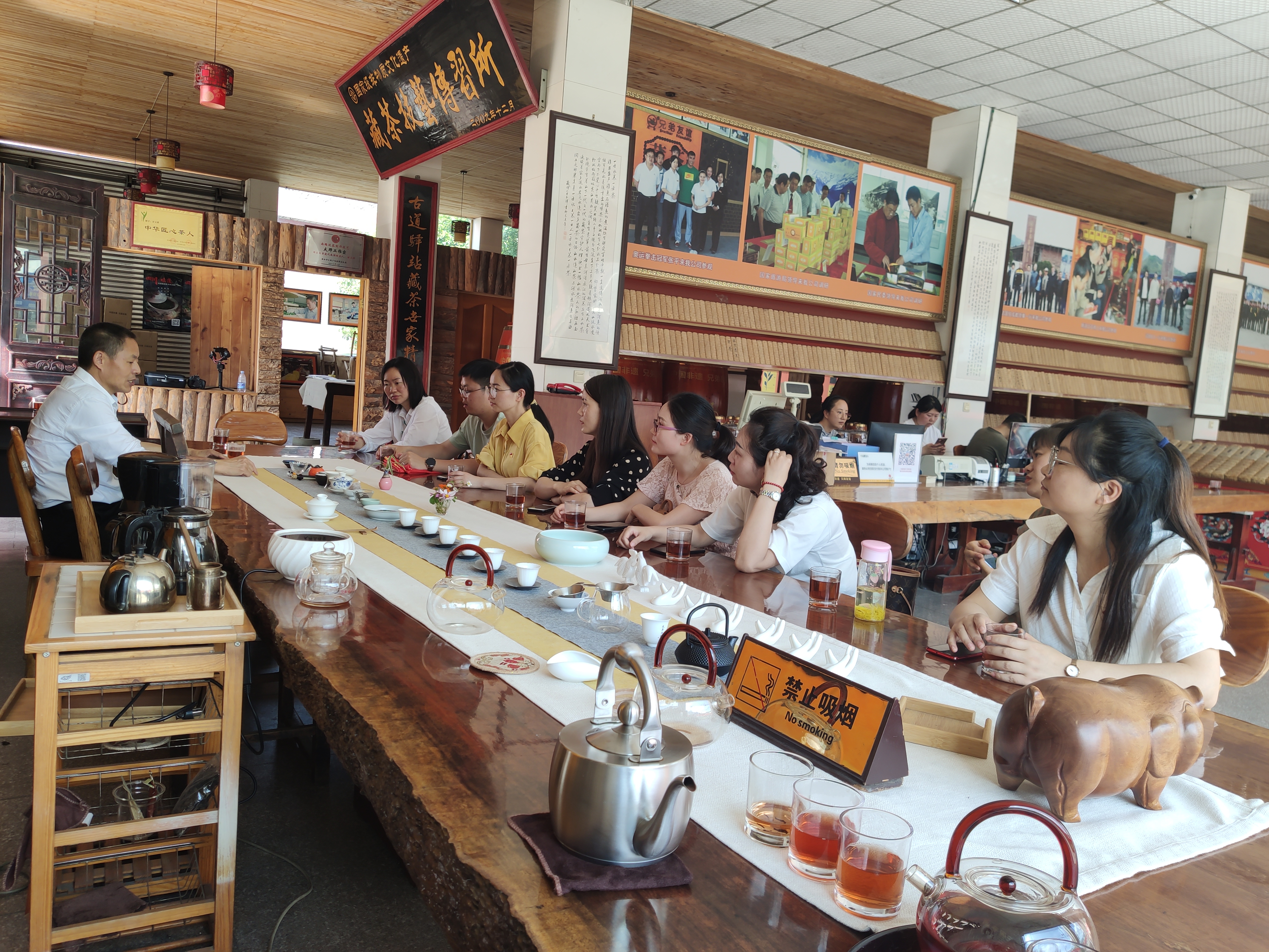 非遗承载灿烂文明,传承悠久的历史文化。雅安市友谊茶叶有限公司汇聚了技艺、基地、传承人三项国家非遗殊荣,在全国茶行业,目前是唯一的。beat365第二党支部的老师们,在国家级非遗传承人、雅安市友谊茶叶有限公司总经理甘玉祥的讲解下,学习了非遗的两个“三”,三级和三项,三级为市级、省级、国家级,三项为技艺、基地、传承人,更深刻的体验到非遗的意义;知道了边茶与藏茶的区别及藏茶的升级换代—“康砖→金竹→甘弘”;了解了各代藏茶的特点及其制作工艺;学会了简单辨别茶品质的方法“闻香、观色、品味”。老师们都感慨甘总学识渊博,书法了得,深刻意识到要干好一件事,一定要静下心、沉住气、踏实干、用心干,这样才能有突破,才能有创新。