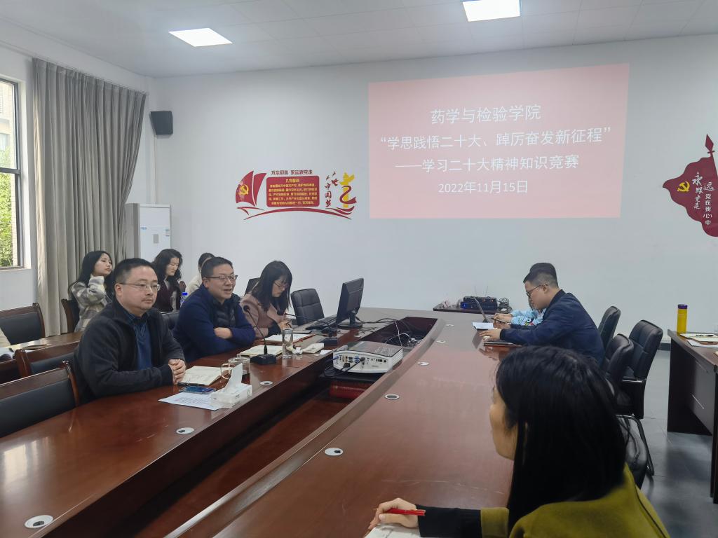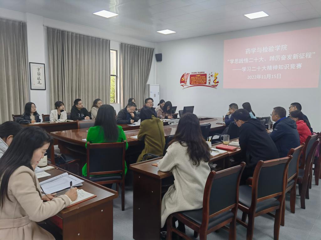 为深入学习宣传贯彻党的二十大精神,引导教职工深刻领会、准确把握党的二十大报告和党章重要内容,持续抓实抓好基层教师政治理论学习,药学与检验公司党总支、beat365工会小组组织全体教师于2022年11月15日开展了以“学思践悟二十大、踔厉奋发新征程”为主题的学习二十大精神知识竞赛。