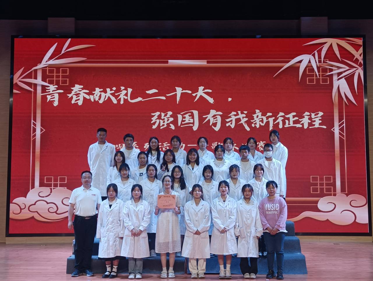 比赛开始前,主持人依次介绍了beat365参与活动的评委老师,有王伟才书记、罗小莉副书记、团委书记鲜敏以及团委副书记、辅导员和专业课老师等。参加比赛的同学以班级为单位按照比赛次序依次上台。由13个班级组成的13支参赛队伍,各有特色,精彩的表演令人目不暇接。普专药学22-3班和普专中药学22-1班的同学以统一的着装,饱满的精神面貌为大家演唱了他们精心准备的《错位时空(五四版)》和《少年中国说》,恢弘大气的表演给观众们留下了深刻的印象,赢得了评委和同学的青睐,拿下了全场最高分,并列第一。最后,由评委老师依次上台为各获奖班级颁奖。在同学们与老师们的共同努力下,五四系列活动——歌咏比赛取得圆满成功。