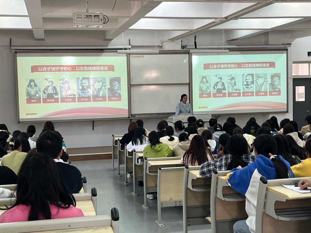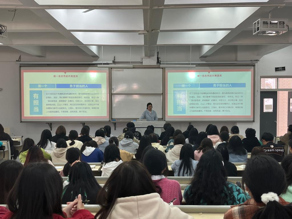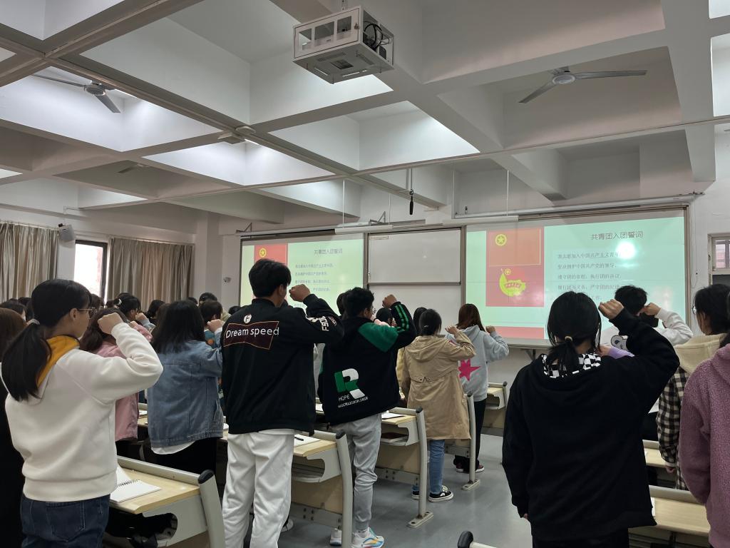 课程开始前,同学们先全体起立举起右手握拳,朗读共青团誓词,重温入团仪式,然后才正式开始本学期的第十期团课学习。鲜敏老师主要为同学们讲了“学习习近平总书记关于青年工作的重要思想”、“员工干部队伍建设”两点内容。讲课过程中,鲜敏老师用李大钊、赵一曼等著名党的代表人物举例,让同学们理解并学习“以铮铮铁骨守初心,以血肉之躯担使命”的精神。说到弘扬雷锋精神时,她又举例郭明义、黄文秀等新时代雷锋精神代表人物,让同学们明白了学习雷锋要从自身做起,从身边做起。最后,鲜老师还嘱咐大家,一名优秀的共青团员应该有担当、有创新、有奉献,在今后的日子里,应该更加努力的学习和工作,不断提高个人素质,做更优秀的自己。