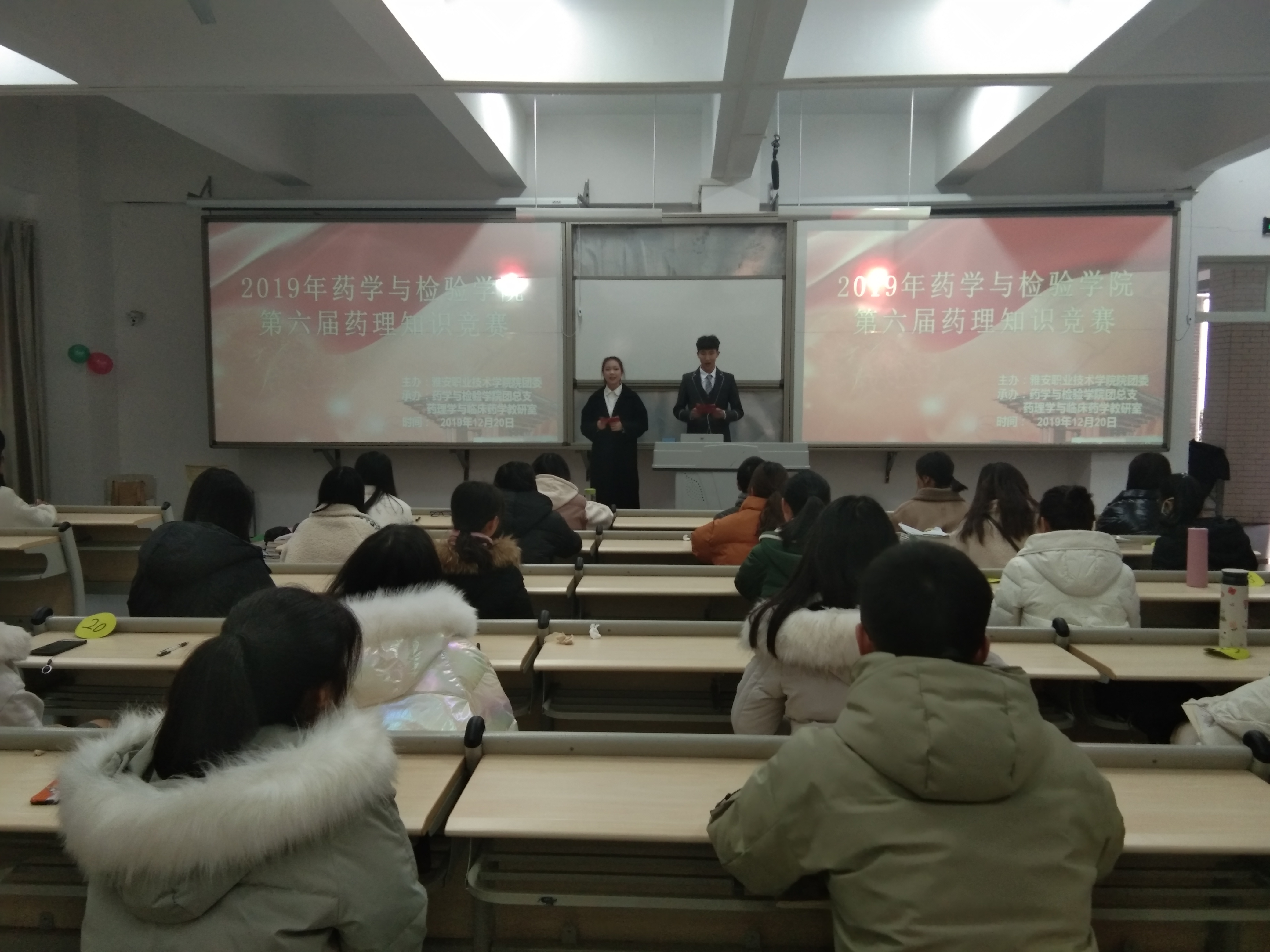 12月20日中午12:40,“第六届药理知识竞赛”决赛在1204教室举行,beat365团总支副书记陈静老师、化学与分析教研室主任林浩、药学和中药教研室老师李飞及参赛队员的亲友团等到场观摩了比赛。