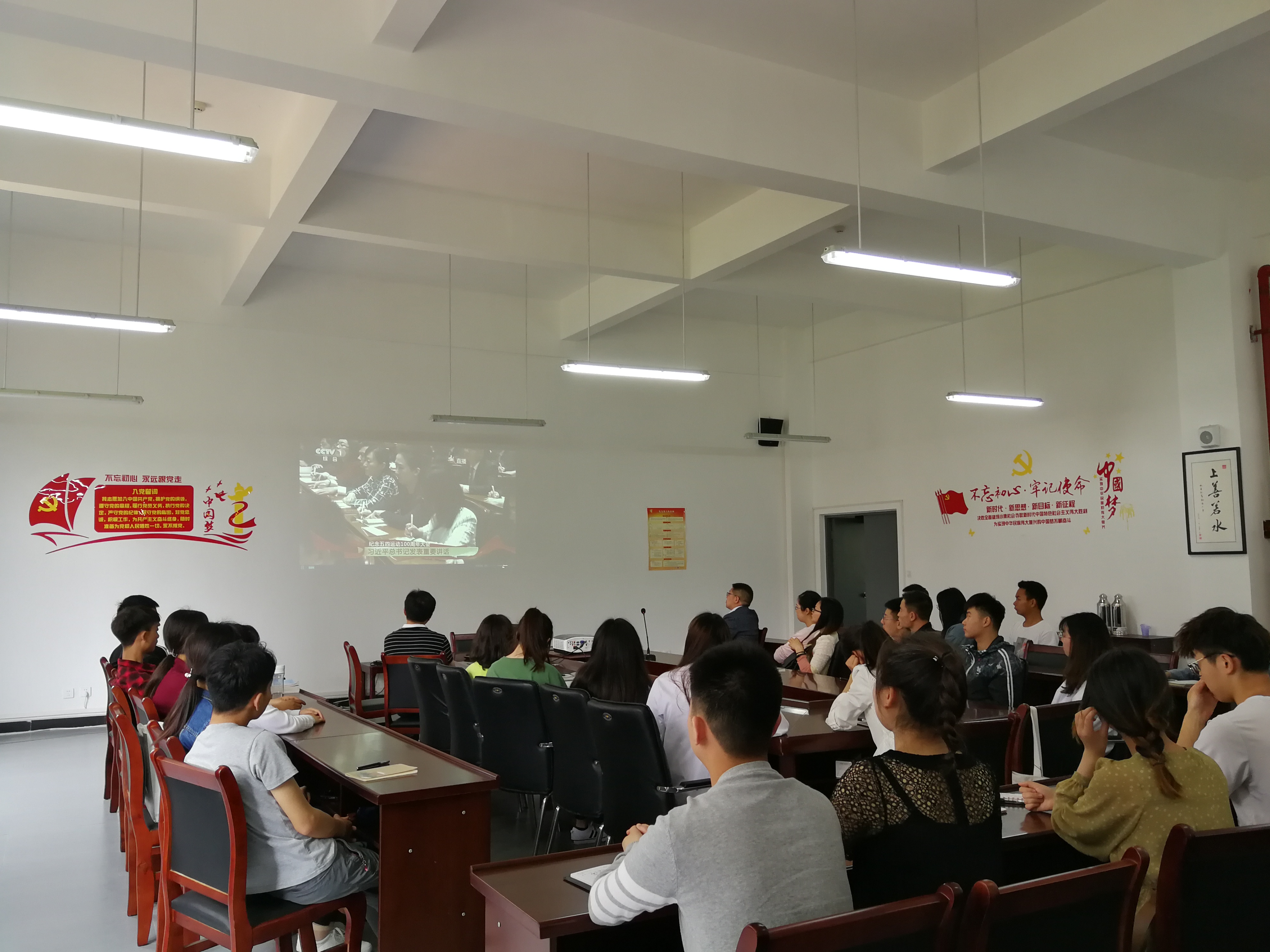 纪念五四运动100周年大会4月30日上午10时30分在人民大会堂举行。中共中央总书记、国家主席、中央军委主席习近平将出席大会并发表重要讲话。为了学习会议精神,加强党员、团干部、团员、青年员工的思想政治教育工作,4月30日10:20,beat365团总支在党总支的带领下,组织了党员教师、员工入党积极分子代表、团员团干代表、青年代表共计40余人,在经开区实训与服务中心校区食品药品生产实训基地205会议室观看了《纪念五四运动100周年大会》直播。