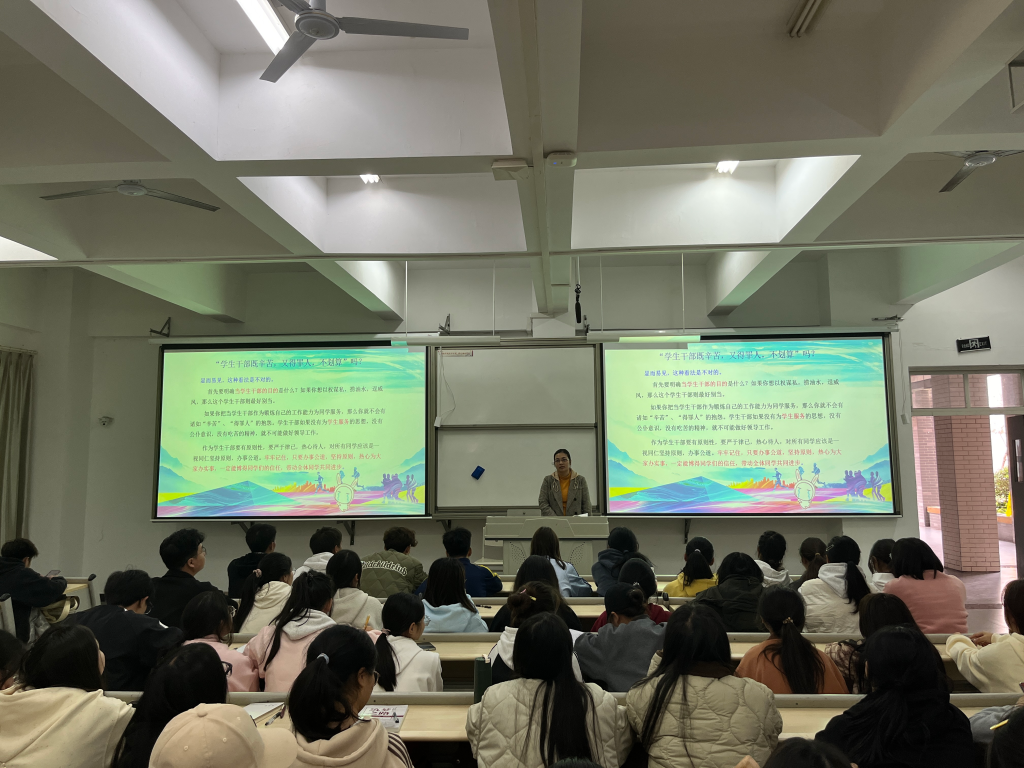 鲜老师首先介绍员工干部的定位,员工干部的组成,这两种角色相互联系不可分割。随后,阐述员工干部的“三我作用”:自我服务、自我教育、自我管理;“四员作用”:宣传委员自上而下、信息员自下而上、服务员教员工活、监督员自律律他。讲座最后,鲜老师对全体员工干部寄予期望:作为员工干部做事要有原则,对所有同学应该一视同仁、办事公道,热心为大家办实事,一定能博得同学们的信任,带动全体同学共同进步。